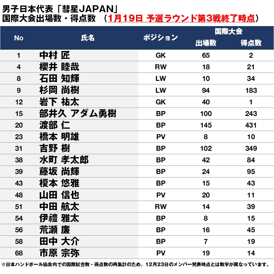 ※日本ハンドボール協会内での国際試合数・得点数の再集計のため、12月23日のメンバー発表時点とは数字が異なっています。