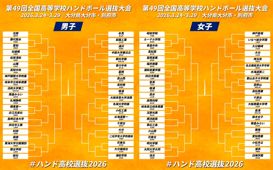 第49回全国高等学校ハンドボール選抜大会が開催されます。その組み合わせ抽選が2月13日に大阪府で行われ、男女それぞれの組み合わせが決定しましたのでお知らせいたします。詳細の競技日程は後日お知らせいたします。