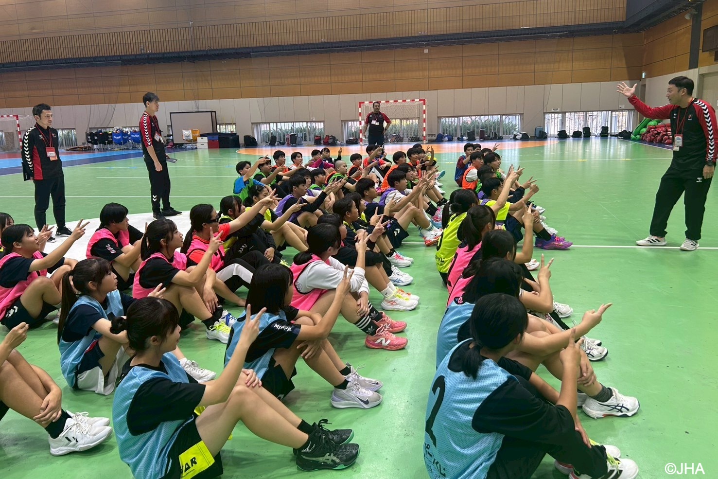 各都道府県協会から推薦された男子選手32人、女子選手25人、および補助指導者20人の参加があり、「身体の操作性の向上(自分のからだをイメージ通りに動かせる)」を目的に、ハンドボールの技術練習だけでなく、さまざまなスポーツの動きを取り入れたトレーニングにもチャレンジしました。