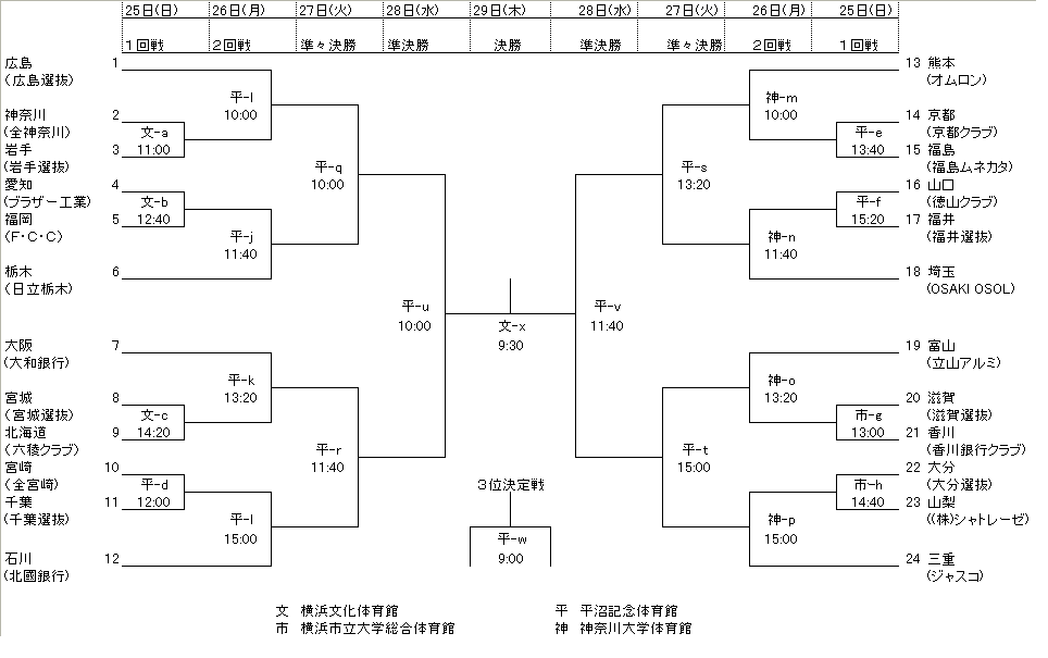 会 場 文:横浜文化体育館 平:平沼記念体育館 市:横浜市立大学総合体育館 神:神奈川大学体育館
