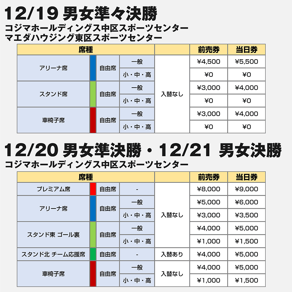 3日目(12/19)は2会場、4日目(12/20)・5日目(12/21)は1会場で試合が行われ、3日とも有料です。