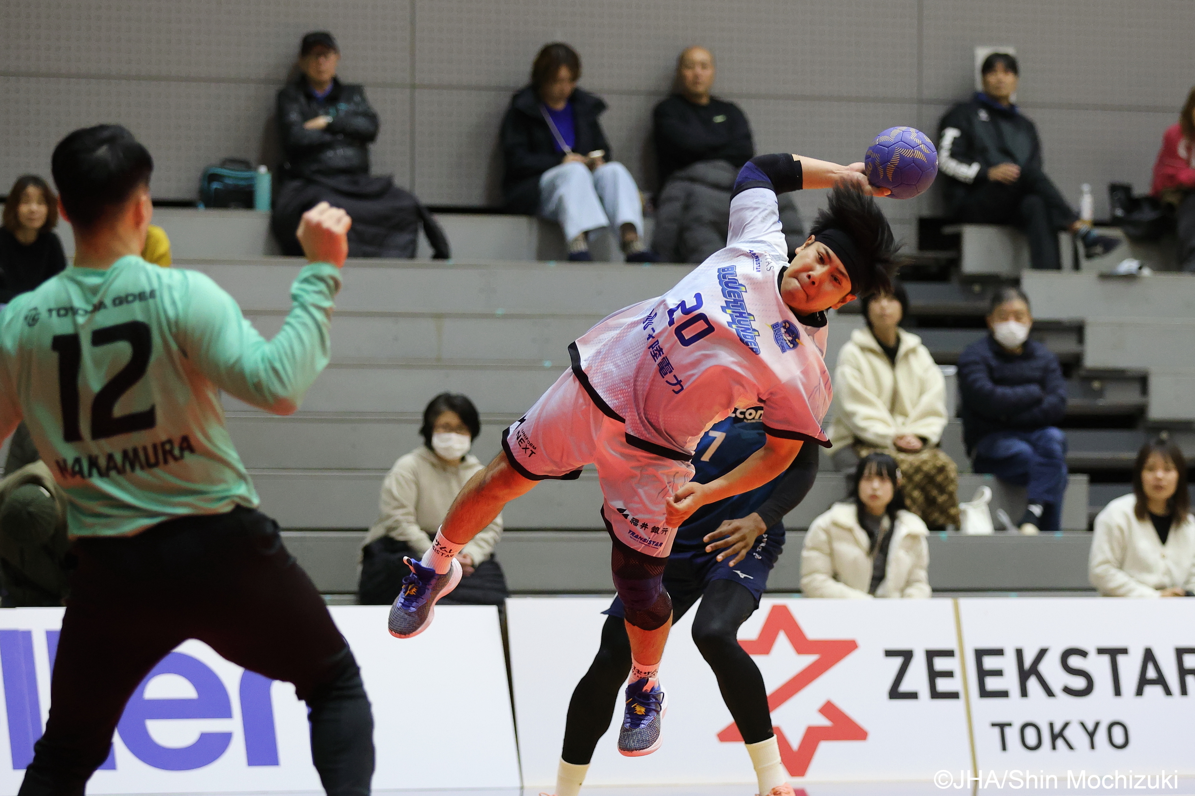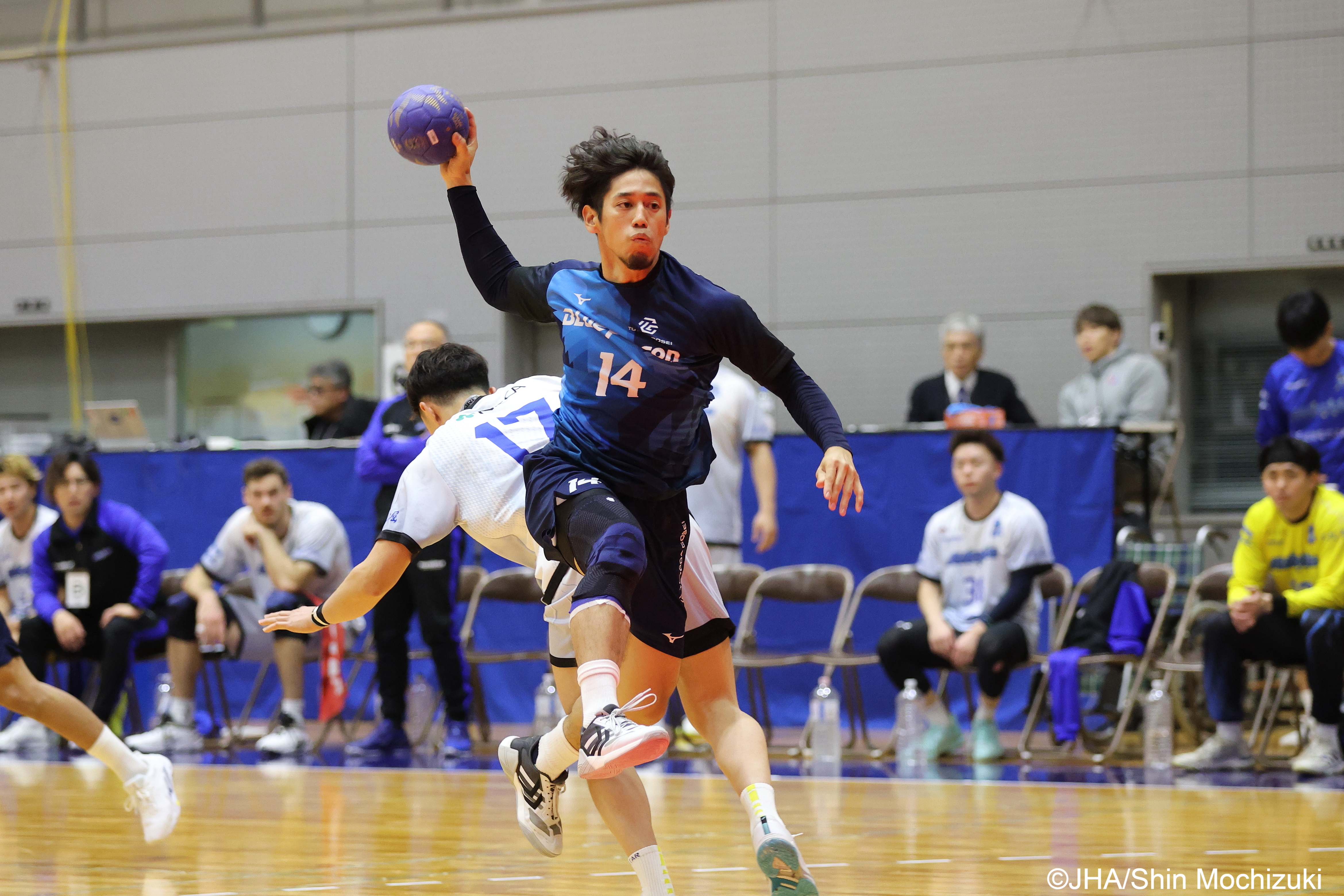 後半も大会6連覇をめざす豊田合成は、古屋悠生、田中大介(写真上)のスピーディーなパスワークで福井永平寺を圧倒し、44-25と19点差で地力を見せつけた。