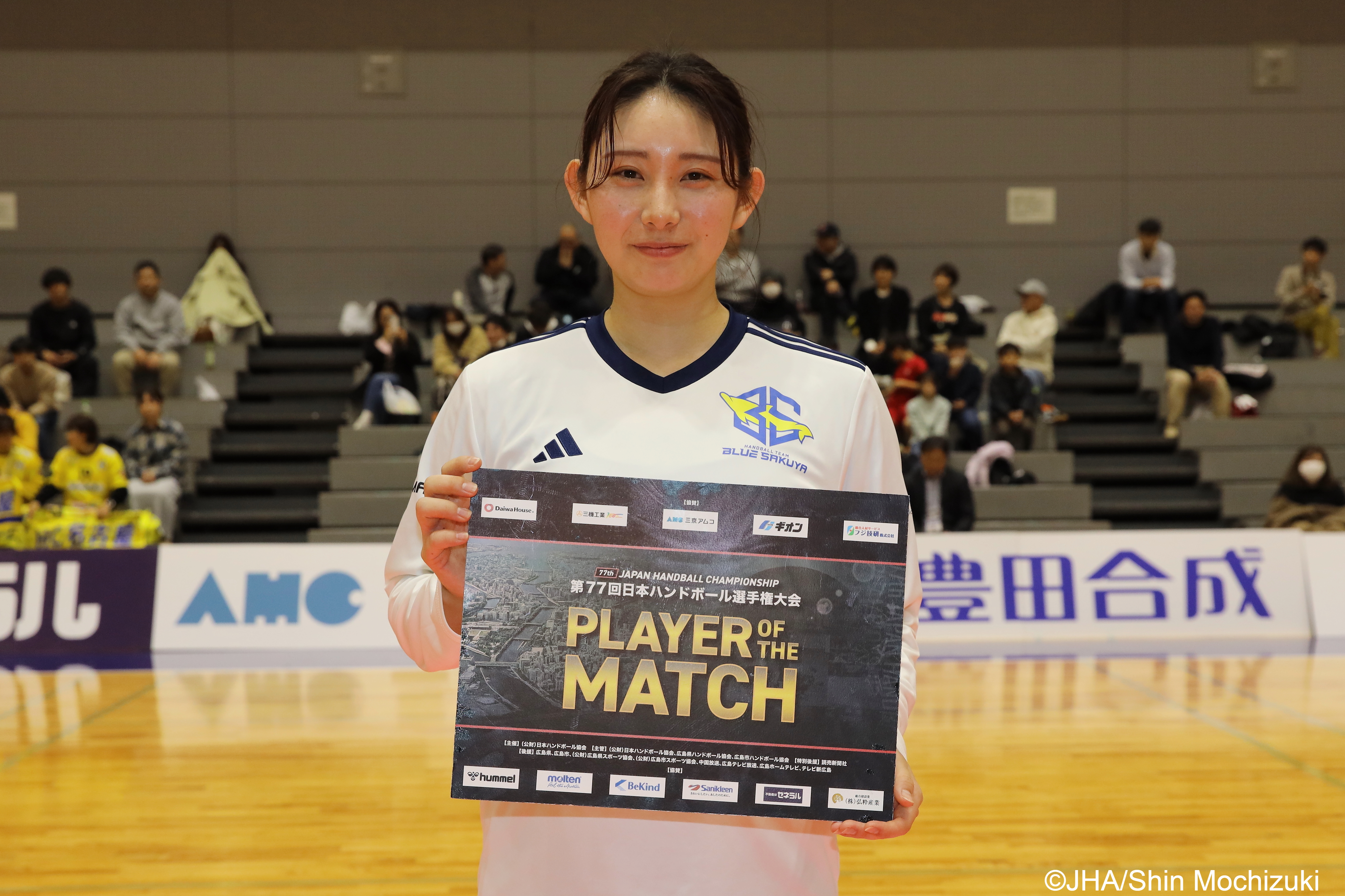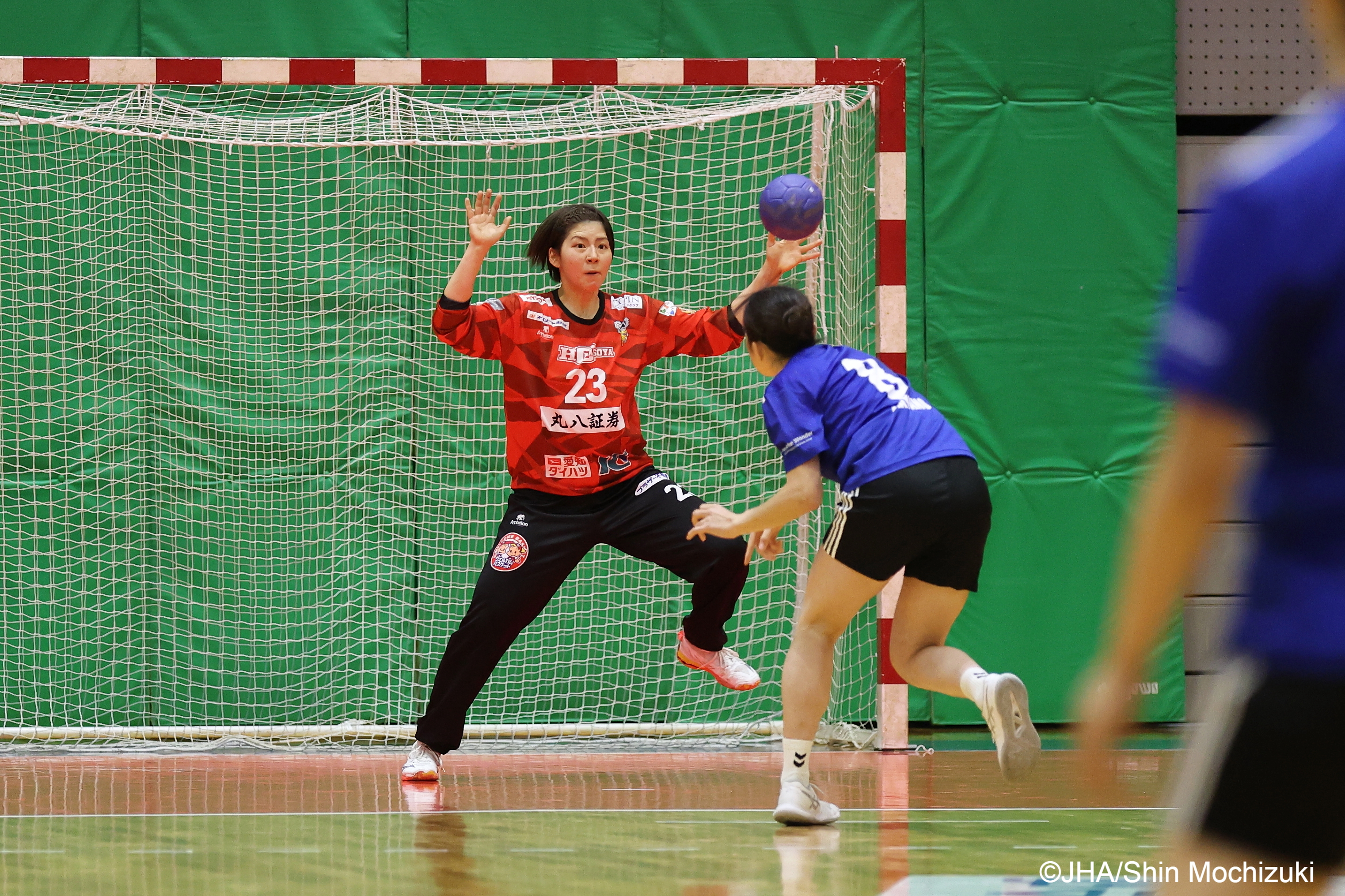 22-19と3点リードのHC名古屋が逃げ切りかと思えた後半残り5分を切ってからGK宝田希緒(写真上)の堅守と青麗子の7mTなどでブルーサクヤがビハインドをはね返し、試合は延長へ。