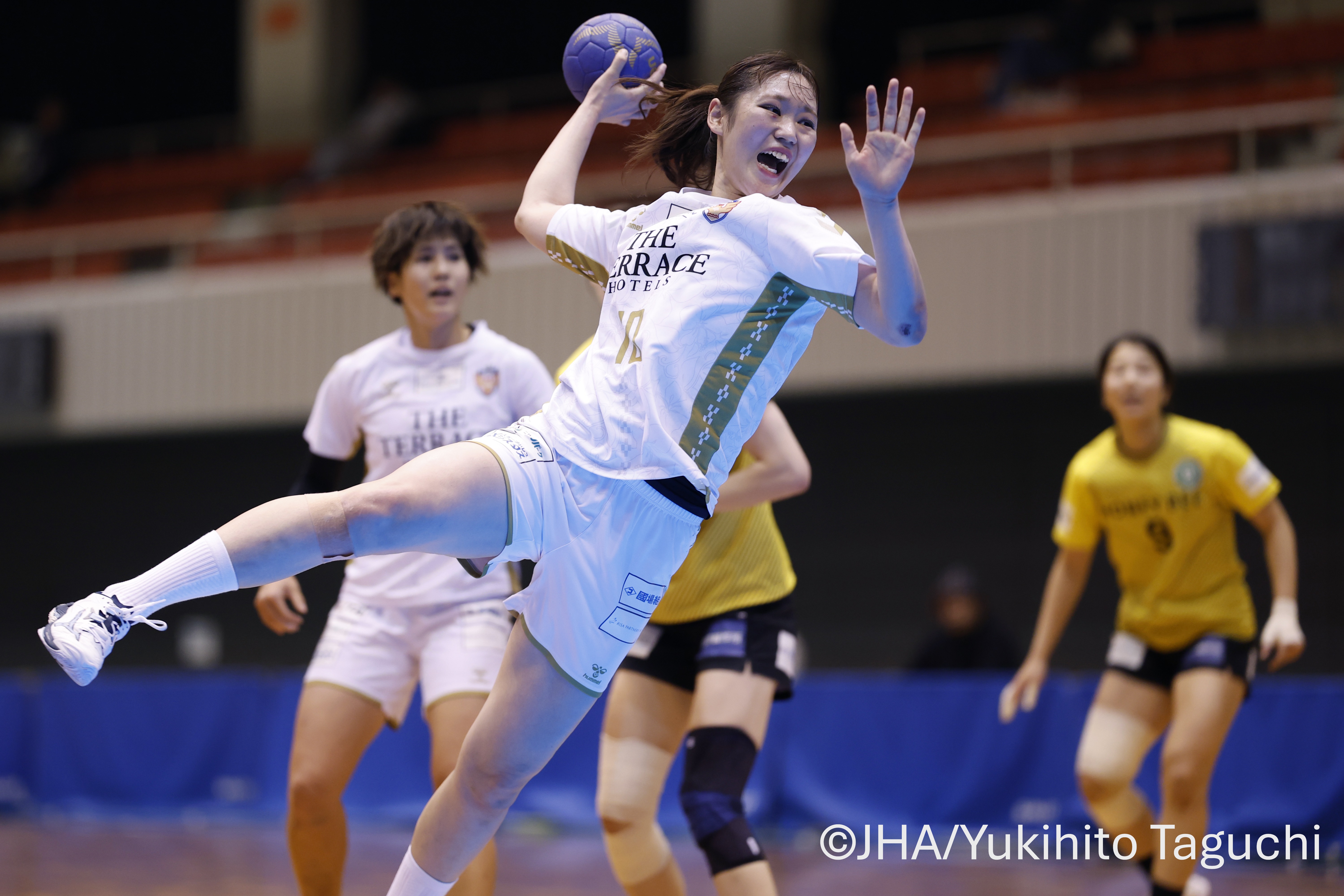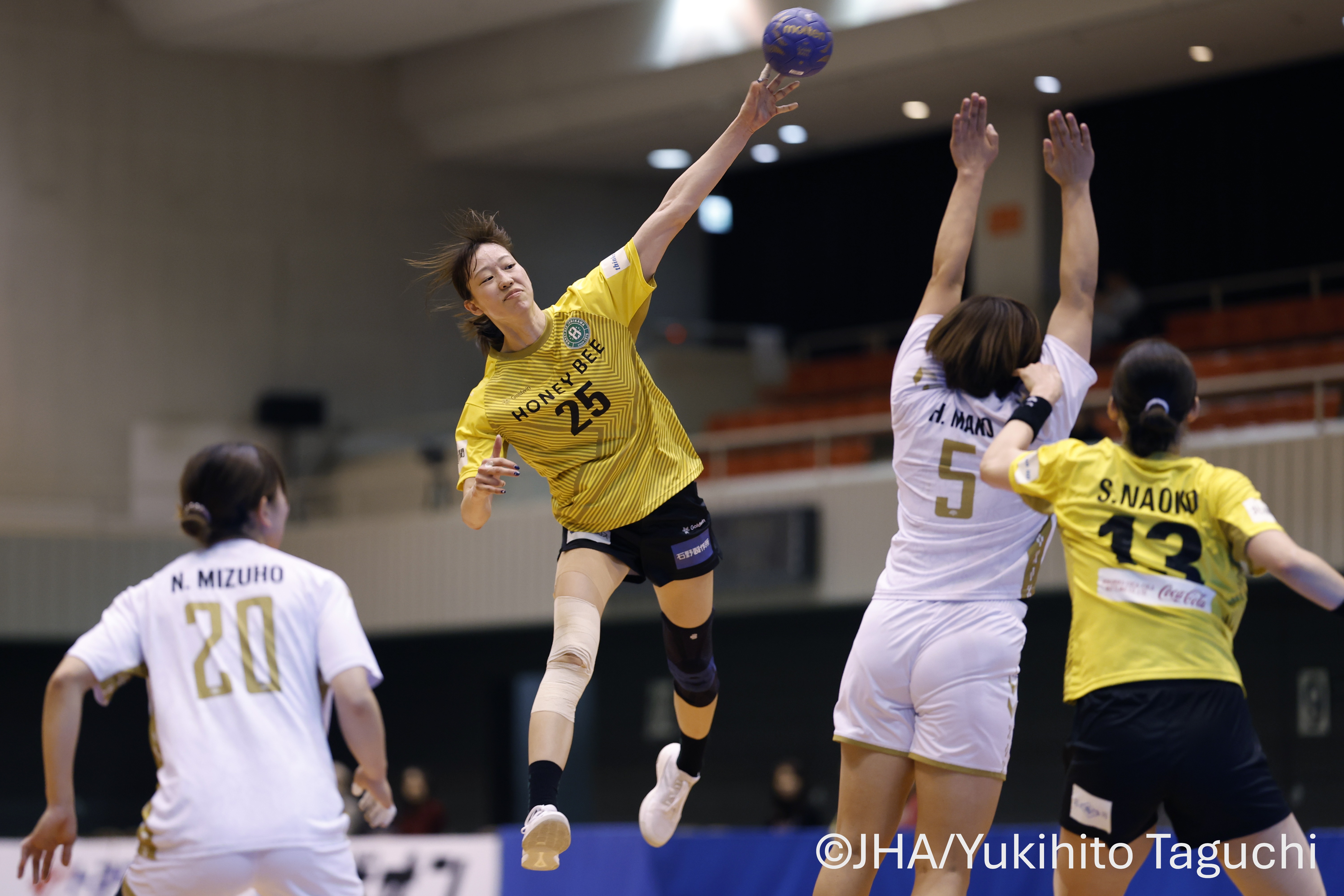 ハニービーはいい形で守れず、得意の速攻をうまく出せずにペースがつかめなかったが、それでも瀧川璃紗らの得点で食い下がり、13-15と2点ビハインドで後半へ。