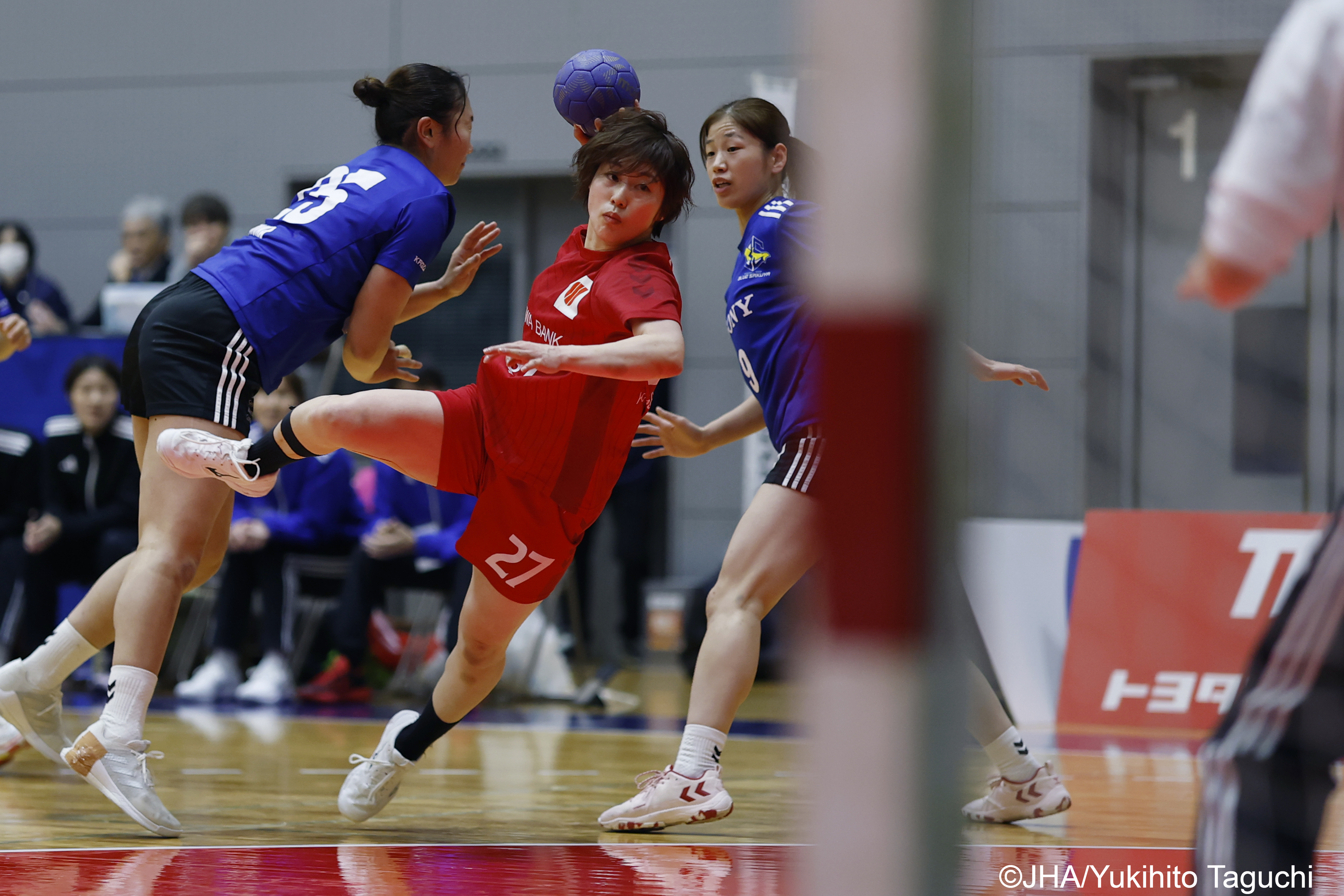 香川銀行GSが前半13分、松浦未南(写真下)のゴールで9-9と同点に追いついてからは、双方が持ち味を発揮するとともに、香川銀行GS・下馬場、ブルーサクヤ・宝田希緒両GKの好守もあり、互角の時間帯が長く続く、
