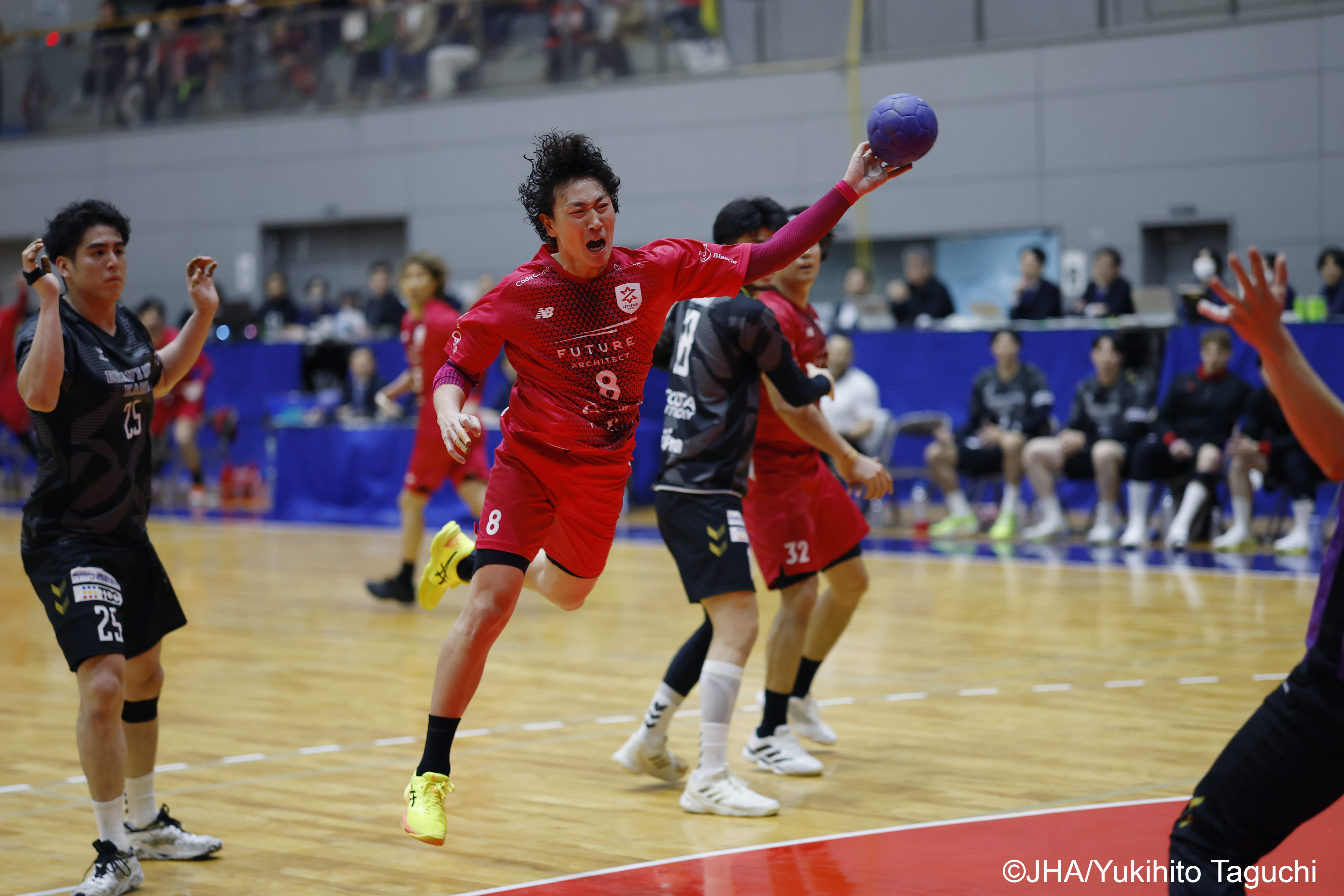 双方に失格者が出る激闘の末、33-33の同点から、最終局面でジークスター・元木博紀がBK刈谷DFの隙をついてコーナーから中央に走り込んで決めたシュート(写真上)が決勝点に。ジークスターは初の決勝進出を果たした。