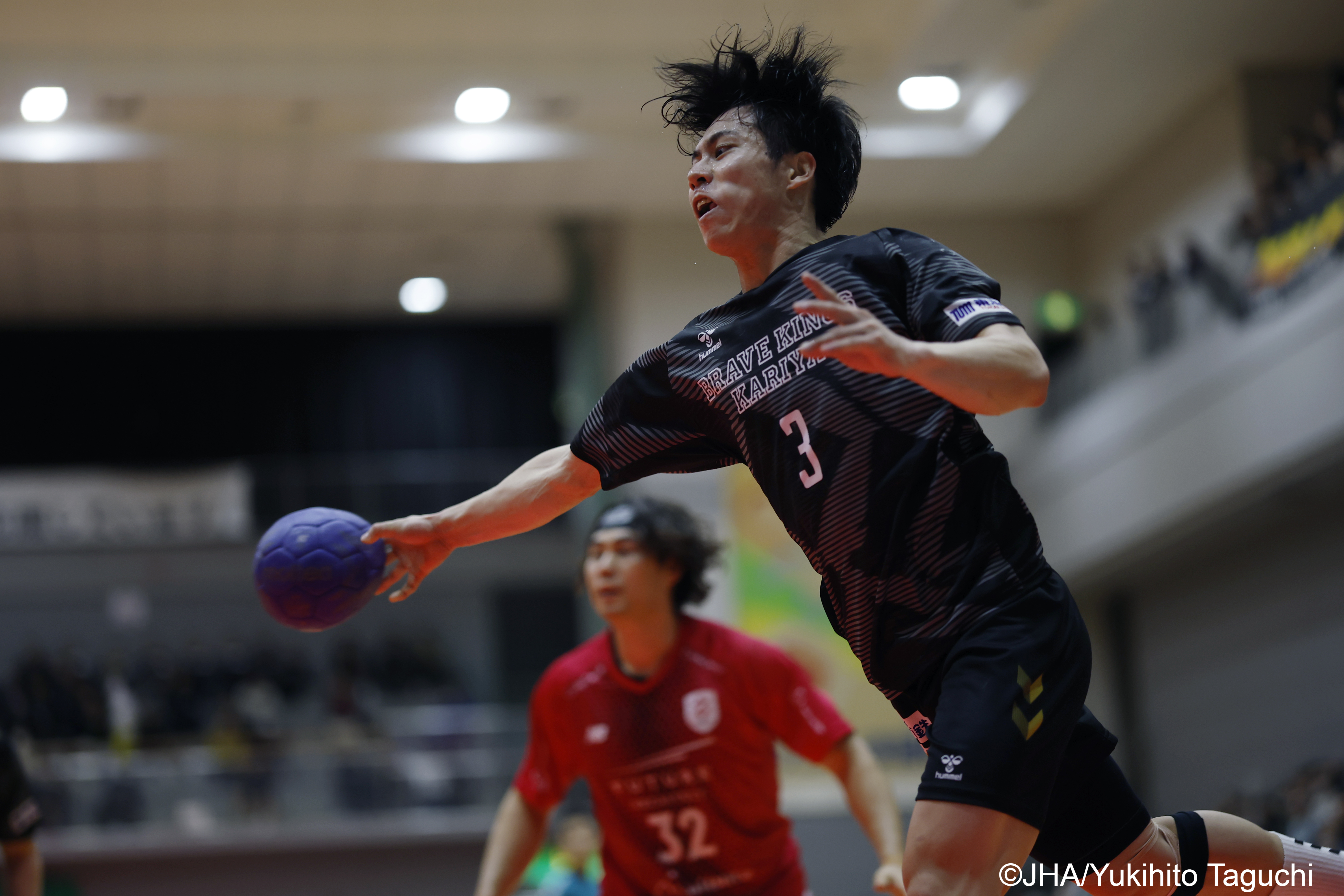 後半に入り、GK加藤芳規の好セーブから吉野樹、パウエル・パチコフスキー、松下海(写真上下)らの活躍で10分、25-25とBK刈谷が同点に追いついてからは、一進一退の大熱戦。