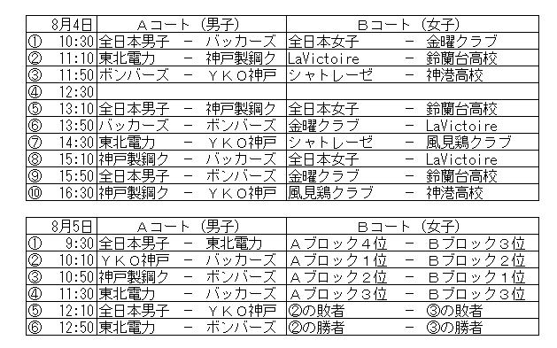 組合せ・日程 参加チーム 男子:全日本男子、東北電力ハンドボールクラブ、西宮ボンバーズ、YKO神戸 神戸製鋼クラブ、Backers 女子Aブロック:全日本女子、金曜クラブ、LaVictoire、鈴蘭台高校 女子Bブロック:シャトレーゼ、風見鶏クラブ、神港高校