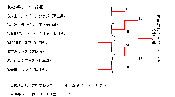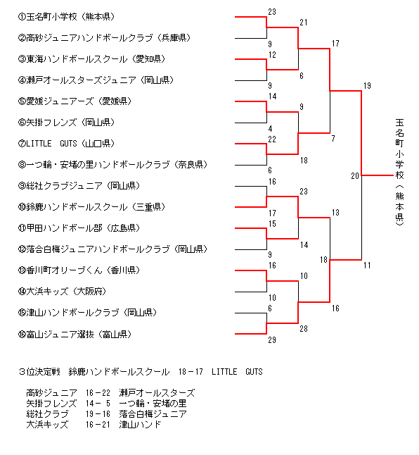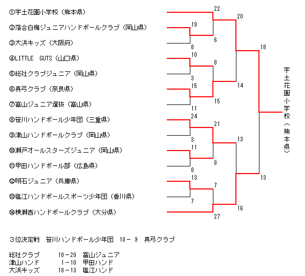 第2日目(平成15年2月2日(日)) ・高学年男子の部準決勝 玉名町小学校 17( 8- 1, 9- 6) 7 LITTLE GUTS 富山ジュニア選抜 16(11- 7, 5- 6)13 鈴鹿ハンドボールスクール ・高学年男子の部3位決定戦 鈴鹿ハンドボールスクール 18( 7-13,12- 4)17 LITTLE GUTS ・高学年男子の部決勝 玉名町小学校 19( 9- 6,10- 5)11 富山ジュニア選抜 ・高学年女子の部準決勝 宇土花園小学校 20(12- 6, 8- 8)14 真弓クラブ 横瀬西ハンドボールクラブ 16(22- 7, 5- 6)13 笹川ハンドボール少年団 ・高学年女子の部3位決定戦 笹川ハンドボール少年団 10( 3- 4, 5- 7) 9 真弓クラブ ・高学年女子の部決勝 宇土花園小学校 18( 6- 8,12- 5)13 横瀬西ハンドボールクラブ ・低学年の部準決勝 香川町オリーブくんJr 19( 9- 6,10- 5)11 津山ハンドボールクラブ LITTLE GUTS 24(11- 4,13- 6)10 矢掛フレンズ ・低学年の部3位決定戦 矢掛フレンズ 11( 6- 3, 5- 1) 4 津山ハンドボールクラブ ・低学年の部決勝戦 香川町オリーブくんJr 18(10- 7, 8- 9)16 LITTLE GUTS 第1日目(平成15年2月1日(土)) ・高学年男子の部1回戦 玉名町小学校 23(14- 7, 9- 2) 9 高砂ジュニアハンドボールクラブ 東海ハンドボールスクール 12( 6 -4, 6- 5) 9 瀬戸オールスターズジュニア 愛媛ジュニアーズ 14( 6- 3, 8- 1) 4 矢掛フレンズ LITTLE GUTS 22(12- 1,10- 5) 6 一つ輪・安堵の里ハンドボールクラブ 鈴鹿ハンドボールスクール 17( 8- 5, 9-11)16 総社クラブジュニア 甲田ハンドボール部 15( 7- 1, 8- 8) 9 落合白梅ジュニアハンドボールクラブ 香川町オリーブくん 16(13- 3, 3- 7)10 大浜キッズ 富山ジュニア選抜 29(15- 3,14- 3) 6 津山ハンドボールクラブ ・高学年男子の部2回戦 玉名町小学校 21(11- 0,10- 6) 6 東海ハンドボールスクール LITTLE GUTS 18(10- 6, 8- 3) 9 愛媛ジュニアーズ 鈴鹿ハンドボールスクール 23(12- 4,11-10)14 甲田ハンドボール部 富山ジュニア選抜 28(15- 2,13- 8)10 香川町オリーブくん ・高学年男子の部敗者戦 瀬戸オールスターズジュニア22(12- 8,10- 8)16 高砂ジュニアハンドボールクラブ 矢掛フレンズ 14( 9- 1, 5- 4) 5 一つ輪・安堵の里ハンドボールクラブ 総社クラブジュニア 19(11- 8, 8- 8)16 落合白梅ジュニアハンドボールクラブ 津山ハンドボールクラブ 21(14-10, 7- 6)16 大浜キッズ ・高学年女子の部1回戦 落合白梅ジュニア ハンドボールクラブ 19( 9- 5,10- 3) 8 大浜キッズ LITTLE GUTS 10( 4- 2, 6- 1) 3 総社クラブジュニア 真弓クラブ 15( 9- 9, 6- 2)11 富山ジュニア選抜 笹川ハンドボール少年団 24(10- 1,14- 2) 3 津山ハンドボールクラブ 瀬戸オールスターズジュニア11( 6- 2, 5- 6) 8 甲田ハンドボール部 明石ジュニア 13( 9- 4, 4- 3) 7 塩江ハンドボールスポーツ少年団 ・高学年女子の部2回戦 宇土花園小学校 22(13- 2, 9- 4) 6 落合白梅ジュニアハンドボールクラブ 真弓クラブ 15( 6- 4, 9- 4) 8 LITTLE GUTS 笹川ハンドボール少年団 21(11- 4,10 -4) 8 瀬戸オールスターズジュニア 横瀬西ハンドボールクラブ 27(15- 3,12- 4) 7 明石ジュニア ・高学年女子の部敗者戦 富山ジュニア選抜 20(11- 5, 9- 5)10 総社クラブジュニア 甲田ハンドボール部 10( 6- 1, 4- 0) 1 津山ハンドボールクラブ 大浜キッズ 18( 7- 9,11- 4)13 塩江ハンドボールスポーツ少年団 ・低学年の部1回戦 香川町オリーブくんJr 22(14- 2, 8- 2) 4 総社クラブジュニア LITTLE GUTS 19( 9- 3,10- 9)12 大浜キッズ 矢掛フレンズ 9( 8- 3, 1- 2) 5 川西コジマーズ ・低学年の部敗者戦 大浜キッズ 19( 9- 3,10-6) 9 川西コジマーズ