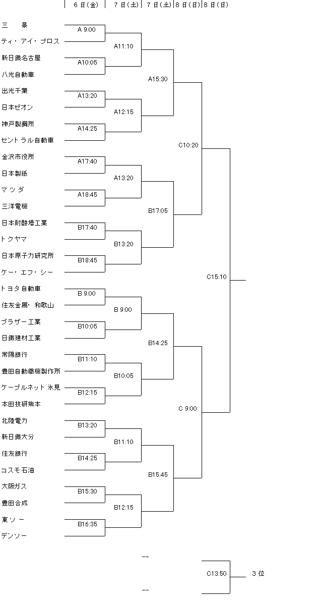 <全日本実業団チャレンジ’98 男子 組合せ> 開催期日 平成10年2月6日(金)〜8日(日) 開催場所 A 出光興産体育館 B コスモ石油体育館 C 市原市臨海体育館