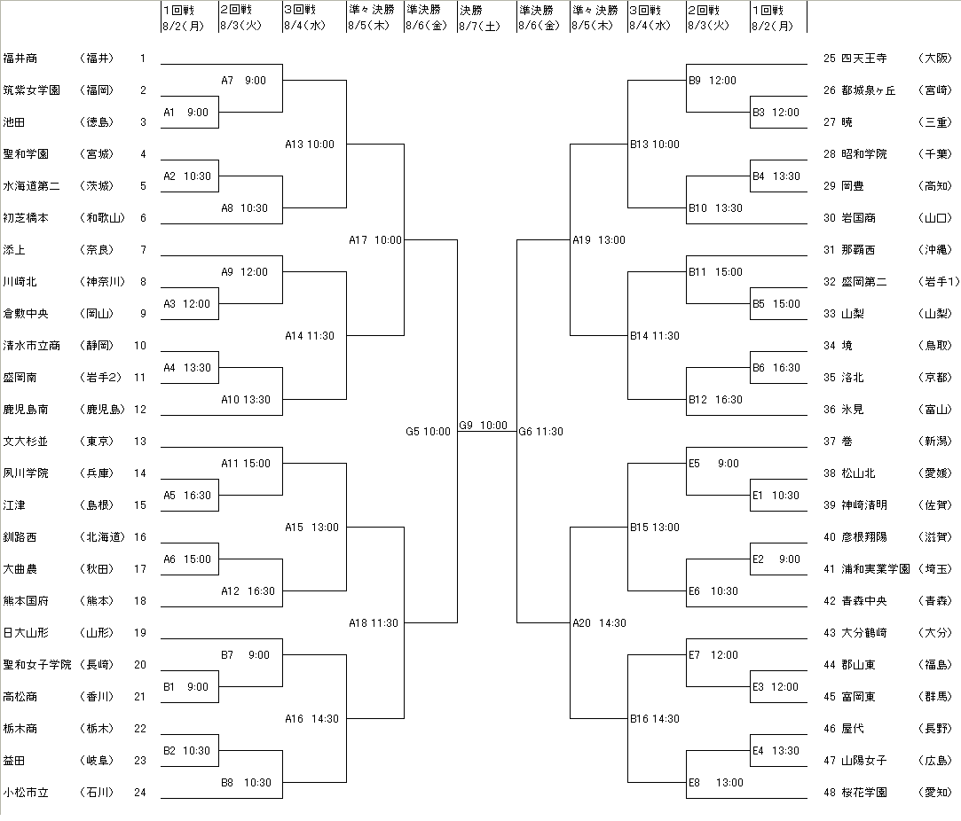 女子組合せ・日程 会 場 A:盛岡体育館 B:盛岡第三高校体育館 C:岩手高校体育館 D:盛岡第一高校体育館 E:盛岡第二高校体育館 F:岩手大学体育館 G:盛岡市アイスアリーナ