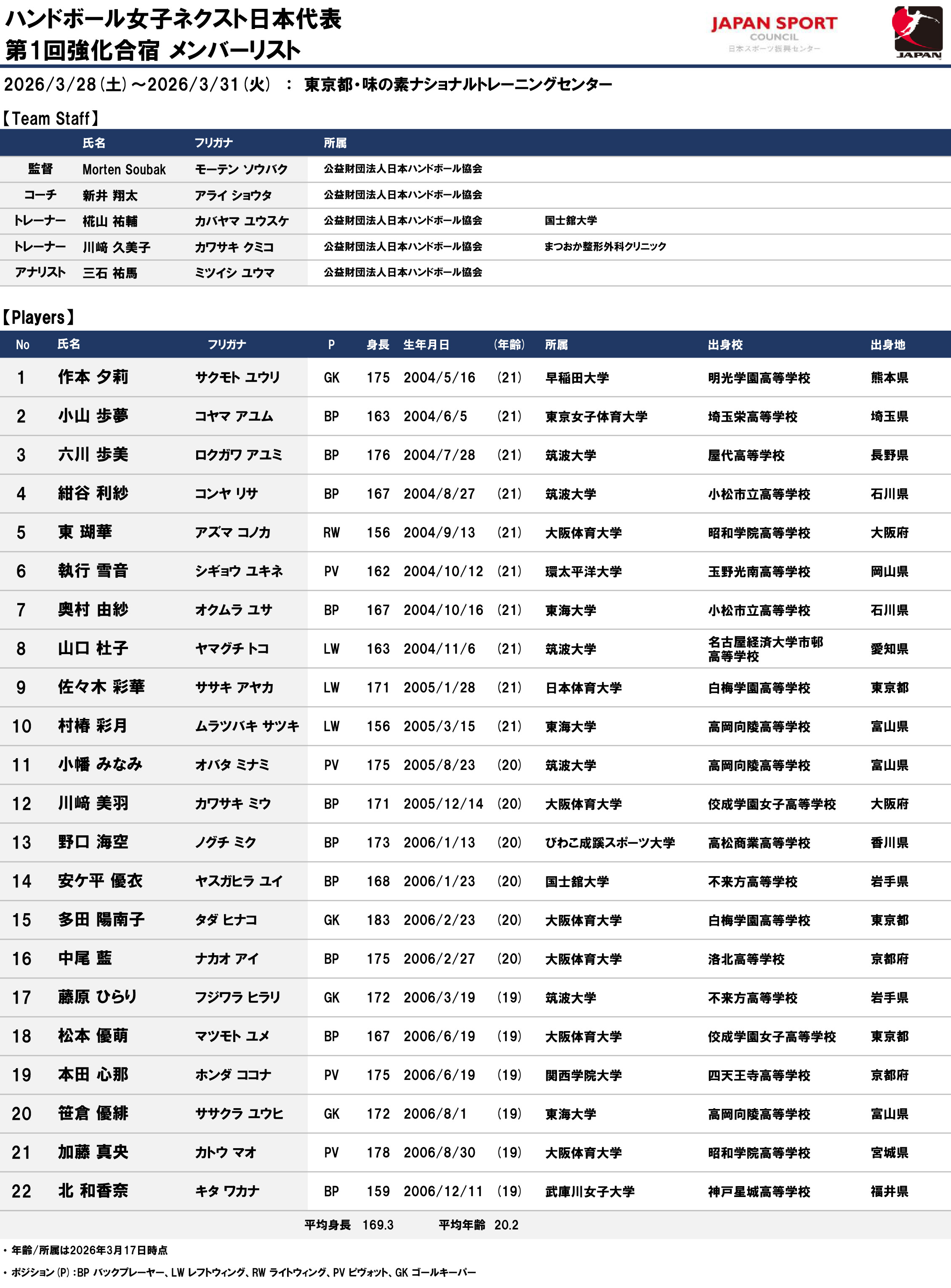 ※ポジション:BP バックプレーヤー、LW レフトウイング、RW ライトウイング、PV ピヴォット、GK ゴールキーパー