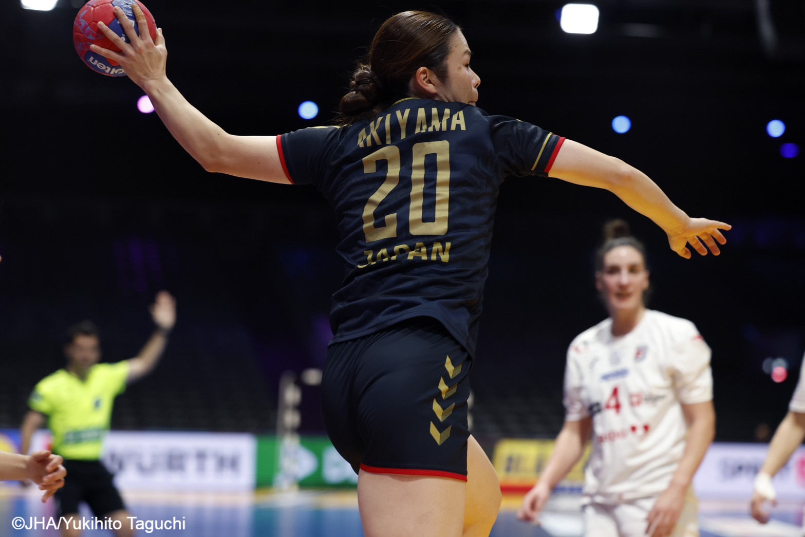 日本は相澤菜月、佐々木春乃を中心に、粘り強く相手DFの間を狙い、秋山なつみ(写真上)が要所でサイドシュートを決めるとともに、守ってもアグレッシブなDFと守護神・亀谷さくらの好守を軸に、理想的なロースコアの展開に持ち込んで、10-10の同点で後半へと向かいました。