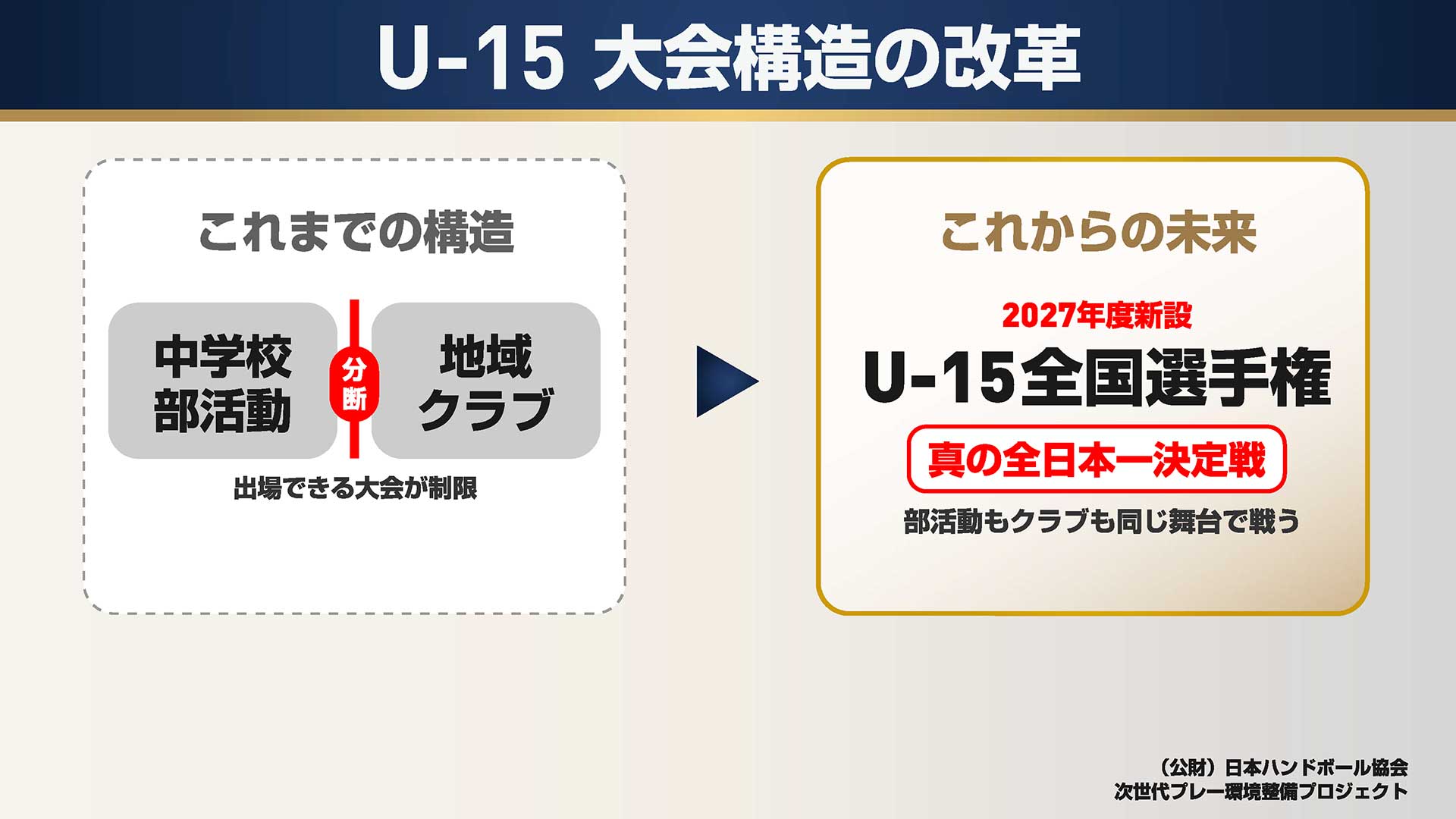 すでに民間、地域のクラブが活動の中心だった水泳などとは異なり、普及、発展、人材発掘など、多くを中学校の部活動が担い続けてきたハンドボールにとって、この決定はより大きな衝撃でした。
